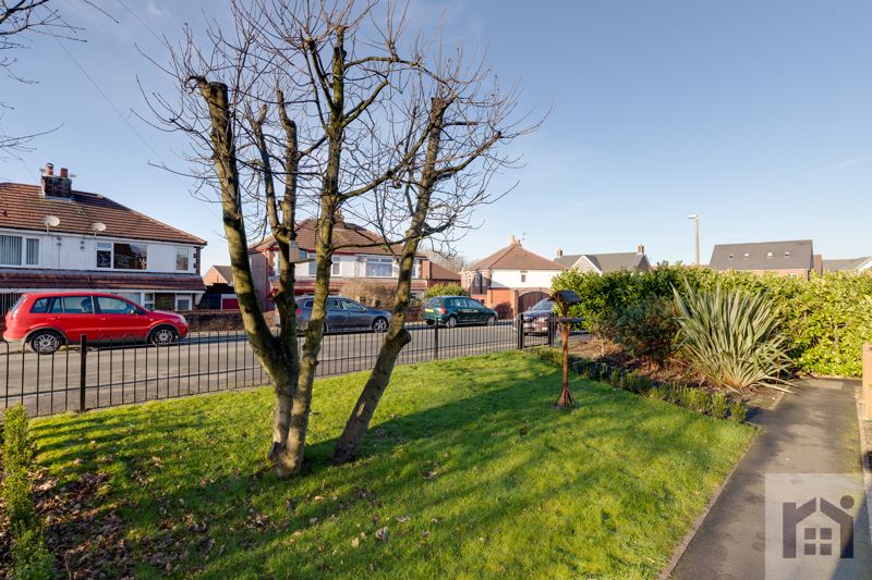 The front garden is bordered by iron railings, box hedging and mature planting with palisade fencing just outside the main entrance containing a range of flowering shrubs.