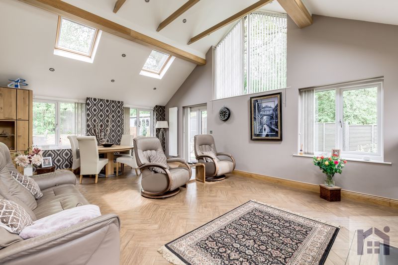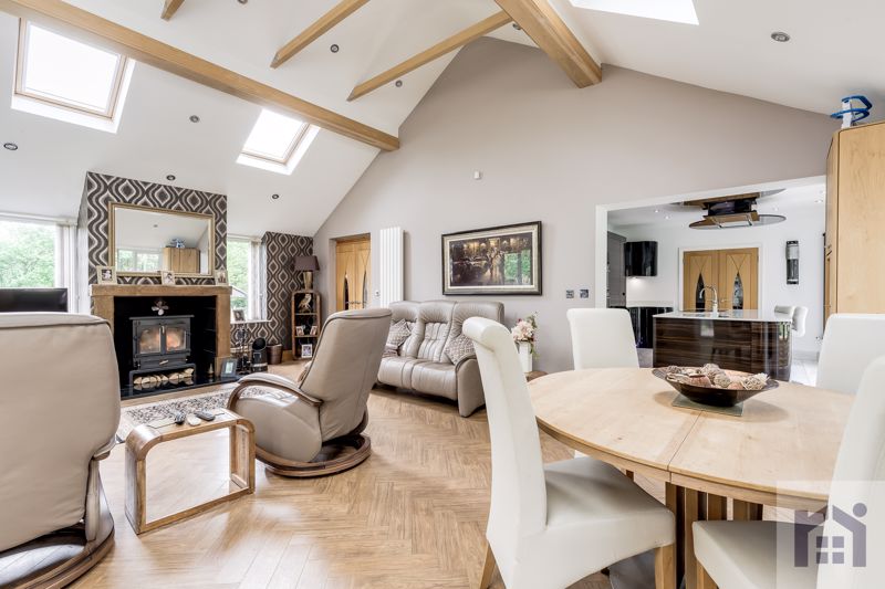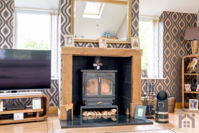 The approach leads to electric gates which open to the four vehicle driveway.  Once parked, you can stroll through mature gardens to the main entrance and step into the welcoming hallway with Amtico flooring which flows into the cloakroom and, separately, through double doors into the vaulted living room with plenty of natural light from windows to three elevations and roof lights.  With a multifuel stove in an imposing hearth this is part of the heart of the house.