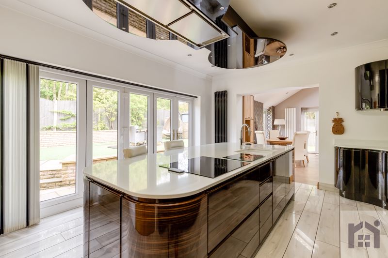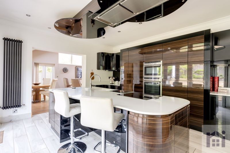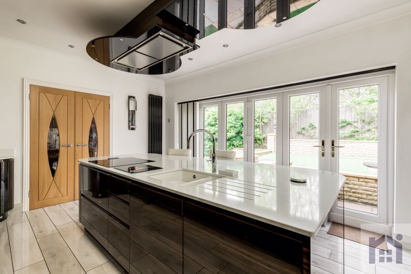 A large archway opens to the breakfast kitchen comprising a range of wall and base units with larder cupboards, quartz work surfaces and etched drainer, breakfast bar and integrated appliances including refrigerator, freezer, dishwasher, washing machine, hob with extractor over, oven, microwave and bifold doors opening to the upper terrace.  Leading off is the dining room which currently makes an excellent study.