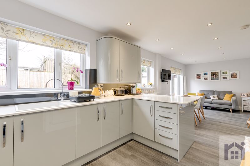 To the right the bay fronted lounge looks out over trees and benefits from a remote controlled inset electric fire for additional warmth and ambience.  Double doors open to the wonderful family room which naturally divides into snug, dining area and kitchen comprising a range of wall and base units with Arctic shimmer quartz work surfaces, Neff induction hob, double electric oven and grill and Worcester combi boiler.  A separate utility room has the same quality of fittings and space, power and plumbing for additional appliances.