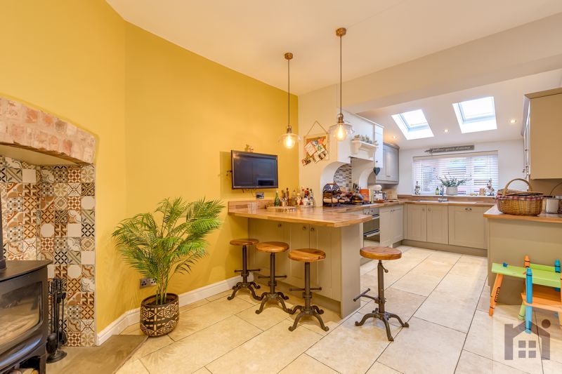 Set back from the road, a block paviour path leads to the main entrance. Step in to the vestibule and from there to the lovely and cosy reception room with multifuel stove. Reception two is to the rear and is an excellent family room with an additional multifuel stove, storage housing the Worcester combi boiler and breakfast bar to the delightful kitchen comprising a range of wall and base units and integrated appliances including gas hob, double electric oven and grill, microwave, dishwasher, fridge, freezer and space, power and plumbing for other appliances. There is plenty of natural light from Velux windows.