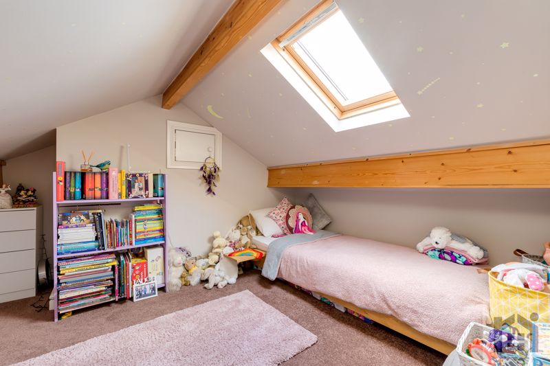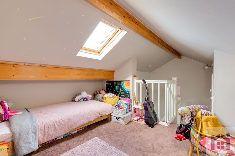 Back inside, carpeted stairs lead to the first floor landing which currently acts as an office space, and there are two double bedrooms. The elegant bathroom comprises fully tiled flooring and elevations, ladder heated towel rail, bath, wc, wash hand basin on floating vanity unit and mixer shower in cubicle. The loft has been converted and is currently used as a bedroom.
